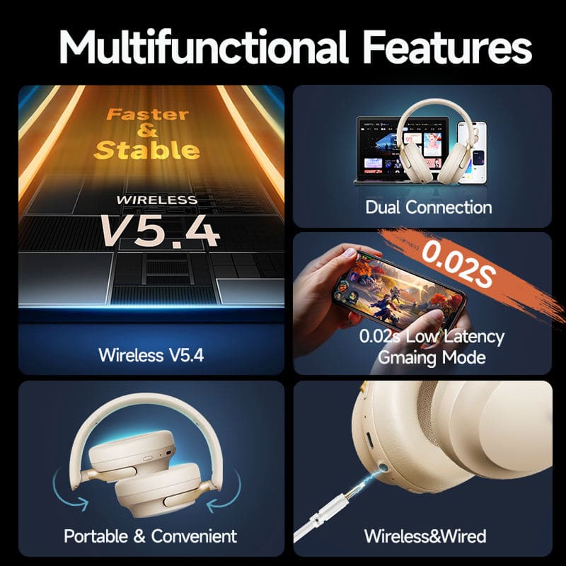 Bluetooth 5.4 technology with dual-device connection capability allows seamless switching between devices, while 30ms low-latency mode ensures perfect synchronization for gaming and video content without any audio delays.