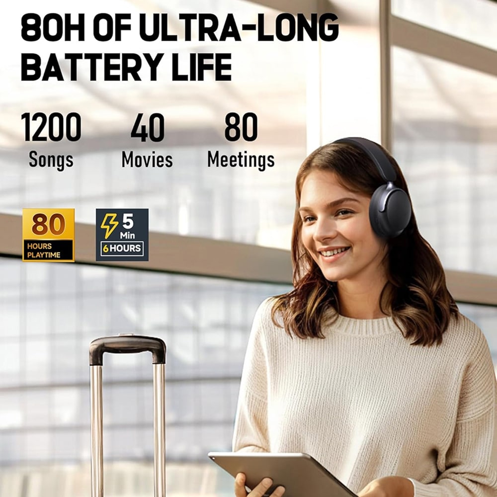 With an impressive 80-hour battery life and rapid 5-minute charging for 6 hours of use, these headphones ensure you never miss a beat during long trips, work sessions, or entertainment marathons.