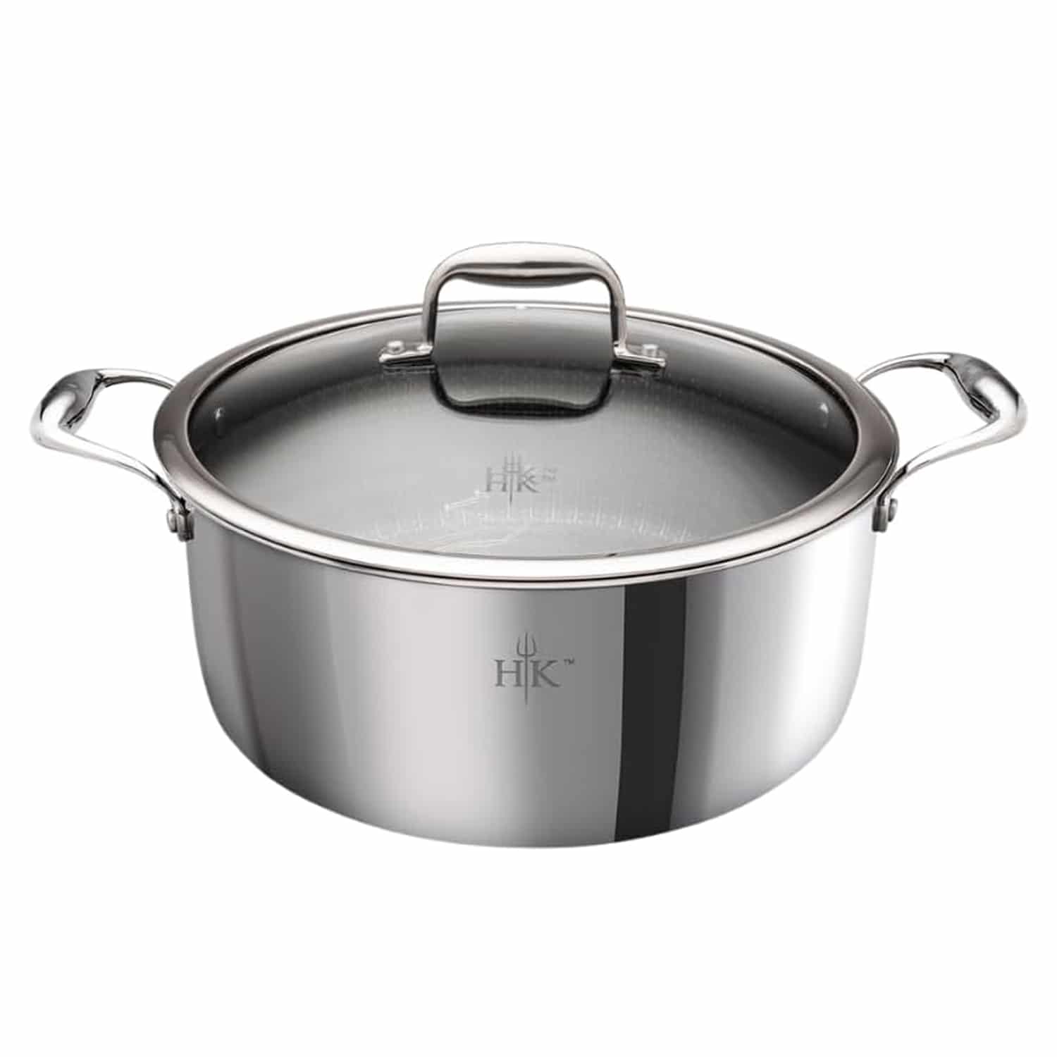 The Hell's Kitchen Titanium Pot features advanced Tri-Clad construction that combines stainless steel durability with a conductive aluminum core for quick and even heating performance. The laser-etched flame pattern above the non-stick surface enhances both aesthetics and functionality.
