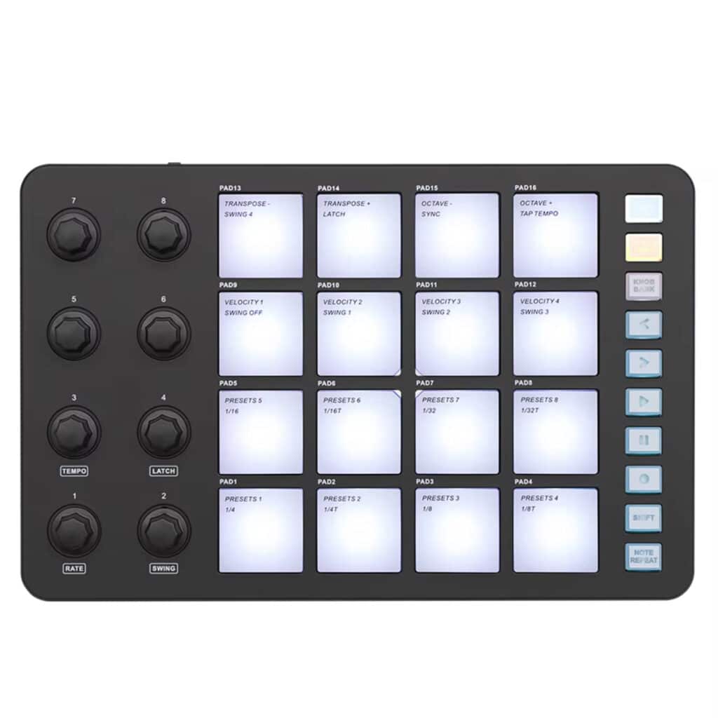 The 16 hyper-sensitive RGB illuminated pads provide reliable performance feedback, while the onboard step sequencer facilitates pattern creation. The flexible pad repeat engine adds dynamic possibilities to rhythm programming.
