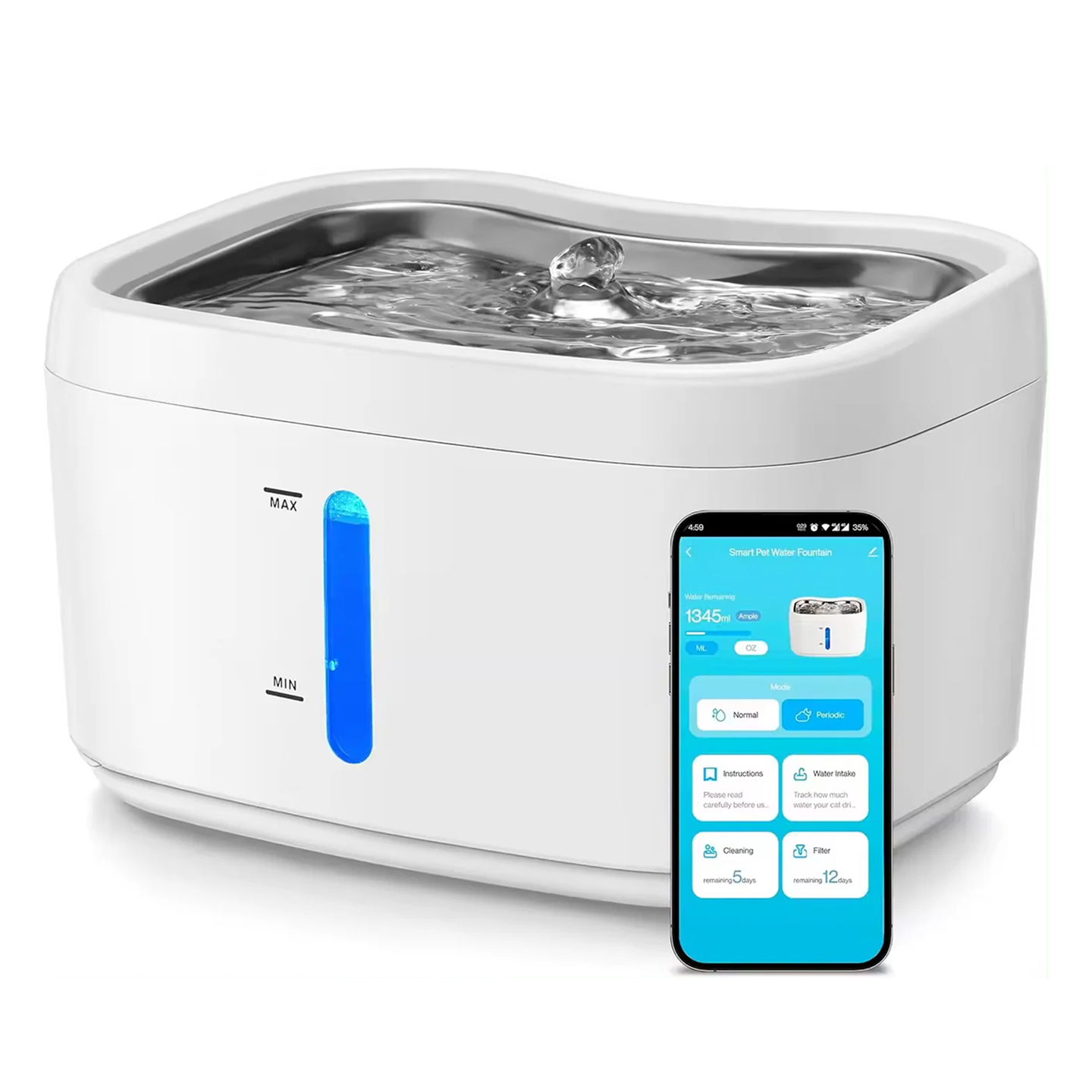 - Detailed water intake statistics via app