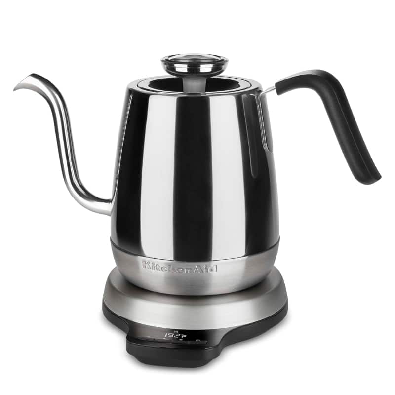 The KitchenAid Electric Kettle With Temperature Control offers impressive functionality with its customizable temperature system, featuring 1-degree increments from 140-212°F. The innovative three-speed flow control adds versatility for different brewing methods.