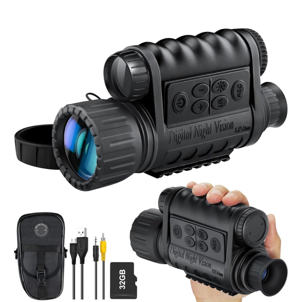 The Bestguarder Night Vision Monocular distinguishes itself with its impressive multi-functional design, combining telescope, camera, and video recorder capabilities. Its 6x magnification and 5x digital zoom provide exceptional versatility for various viewing scenarios.