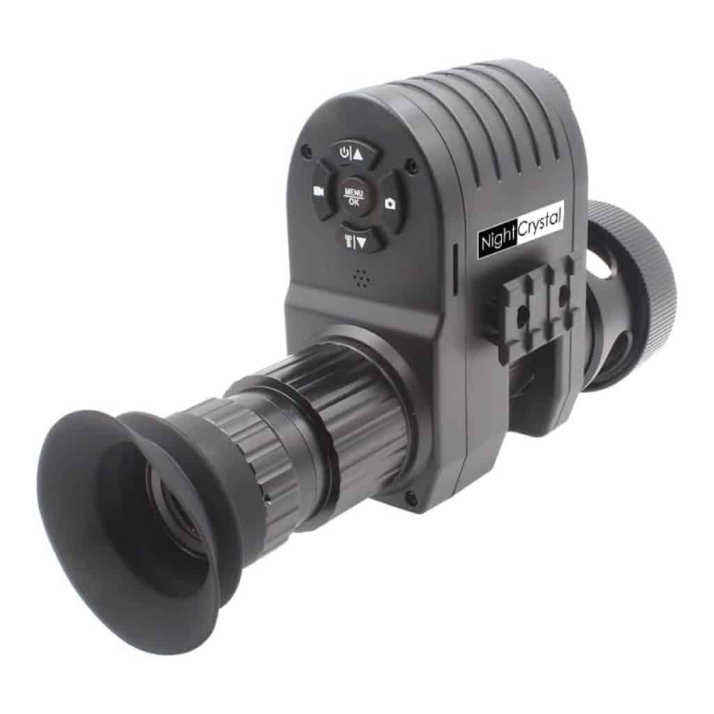 The NightCrystal Night Vision Monocular stands out with its innovative design as a rifle scope attachment, featuring a 1.2-inch integrated screen that displays color images during day use and black-and-white images in darkness.