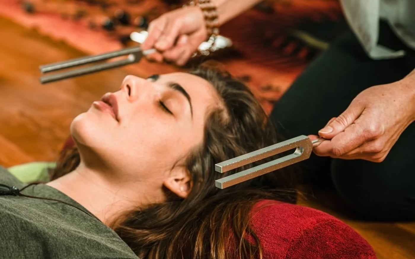 When a tuning fork is struck and applied to the body or held near energy centres, it emits consistent sound waves that interact with the body's natural frequencies. This interaction can help restore balance, reduce pain, alleviate stress, and promote healing by encouraging the body's cells and systems to resonate at optimal frequencies.