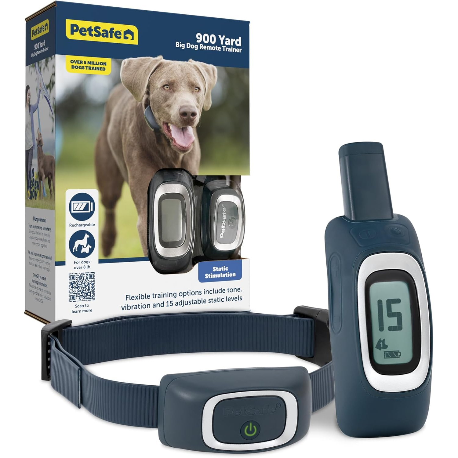 The PetSafe Waterproof Dog Training Collar offers a 900-yard range, providing ample distance for off-leash training. Its 3-in-1 stimulation (tone, vibration, and 15 levels of static) ensures versatile training options. The waterproof remote features a backlit display for easy use in any lighting.